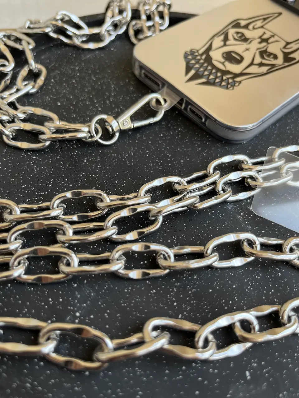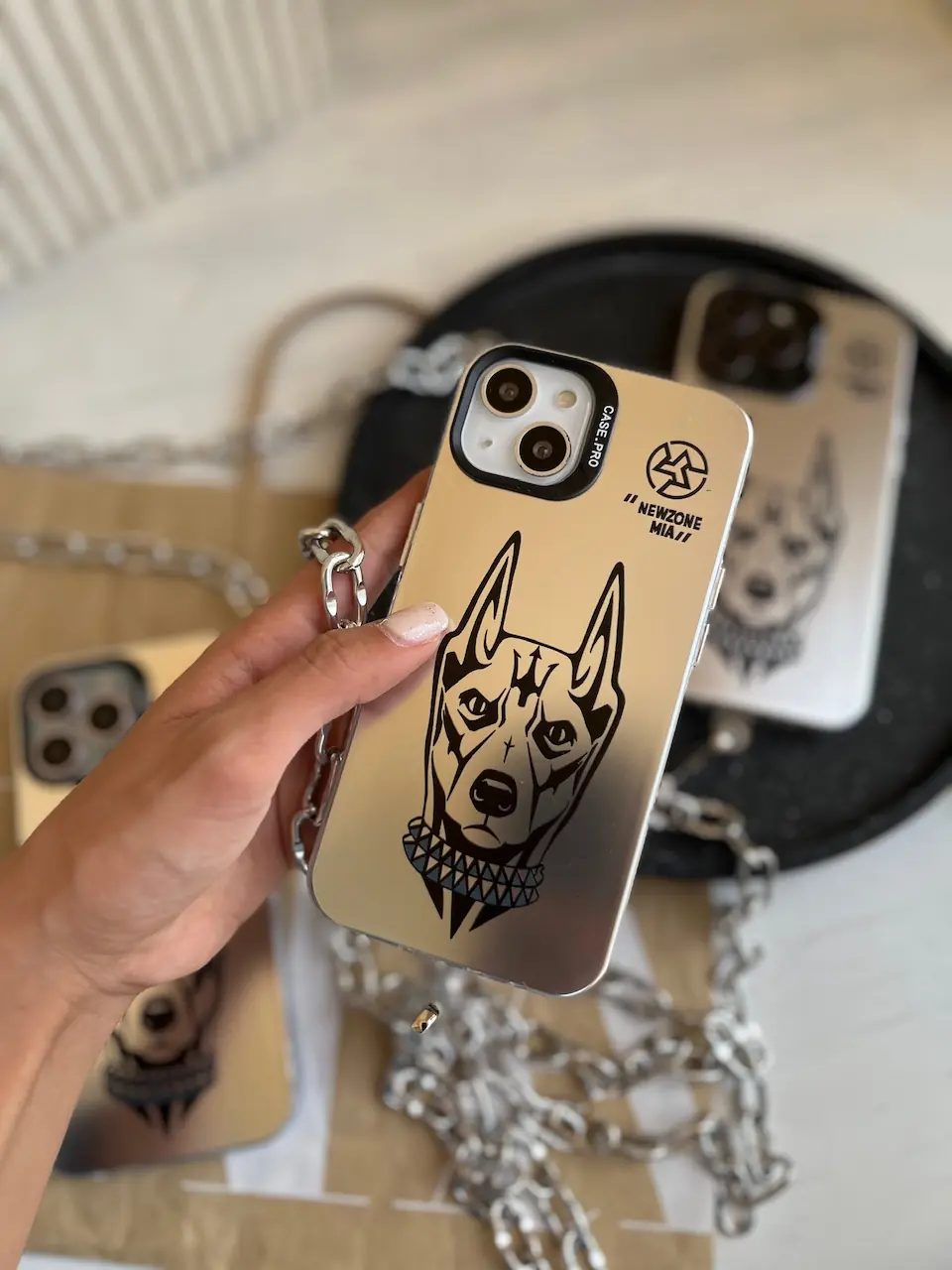 قاب آیفون سنجاق رزینی با طراحی برجسته و جزئیات فلزی، انتخابی خاص برای استایل‌های متفاوت و خاص‌پسند.