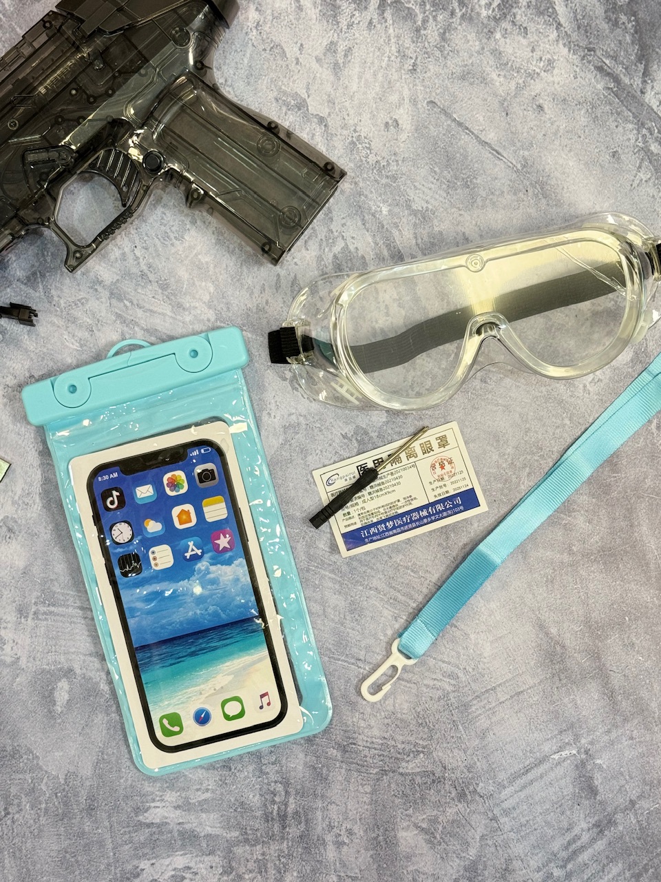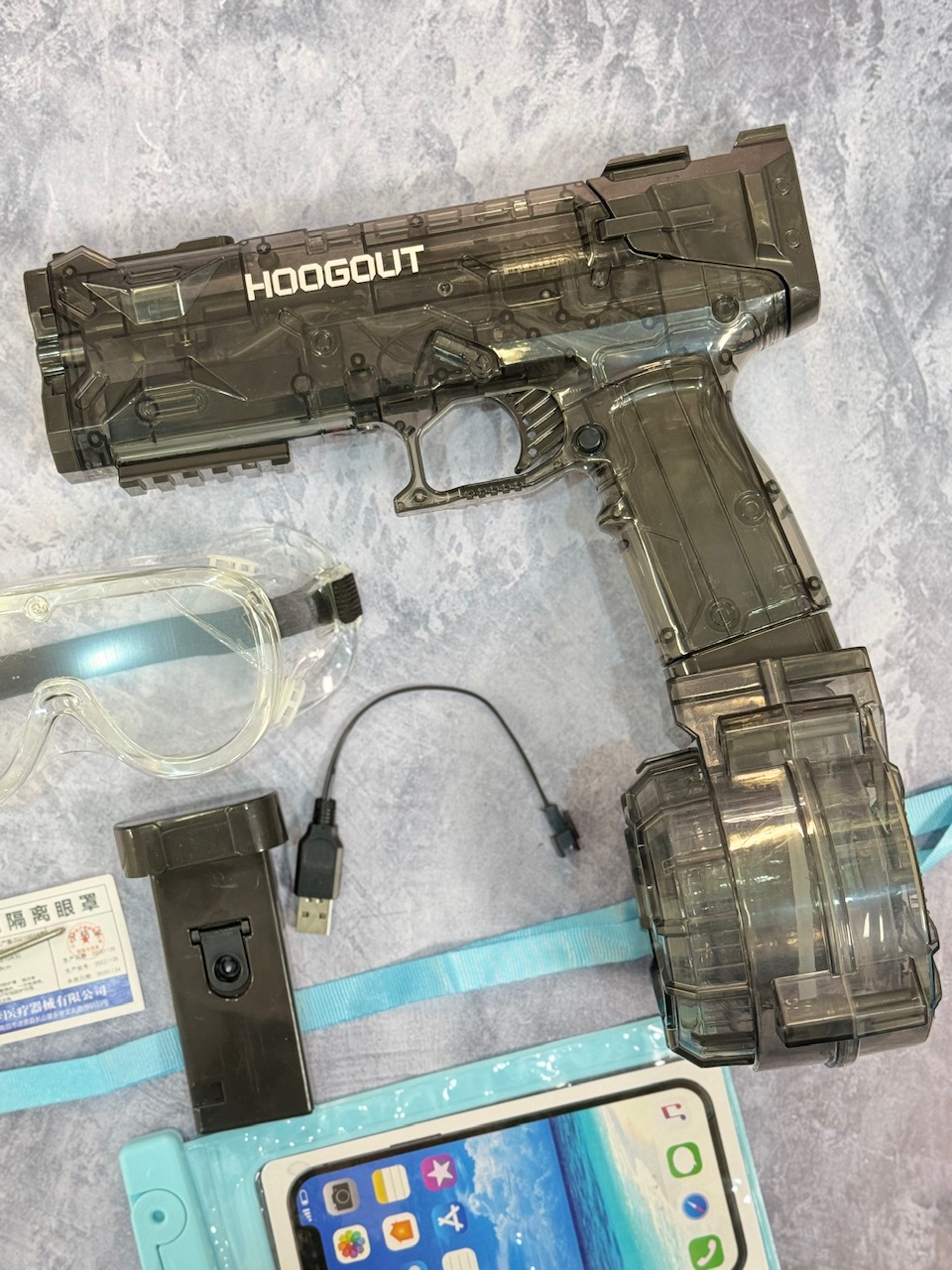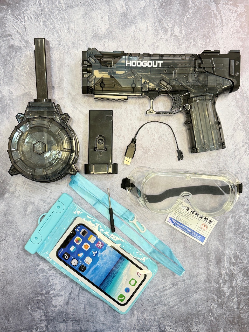 شارژی قدرت پرتاب ۷ تا ۱۰ متر دارای دو خشاب مخزنی و کوچک همراه عینک محافظ همراه کاور ضد اب موبایل