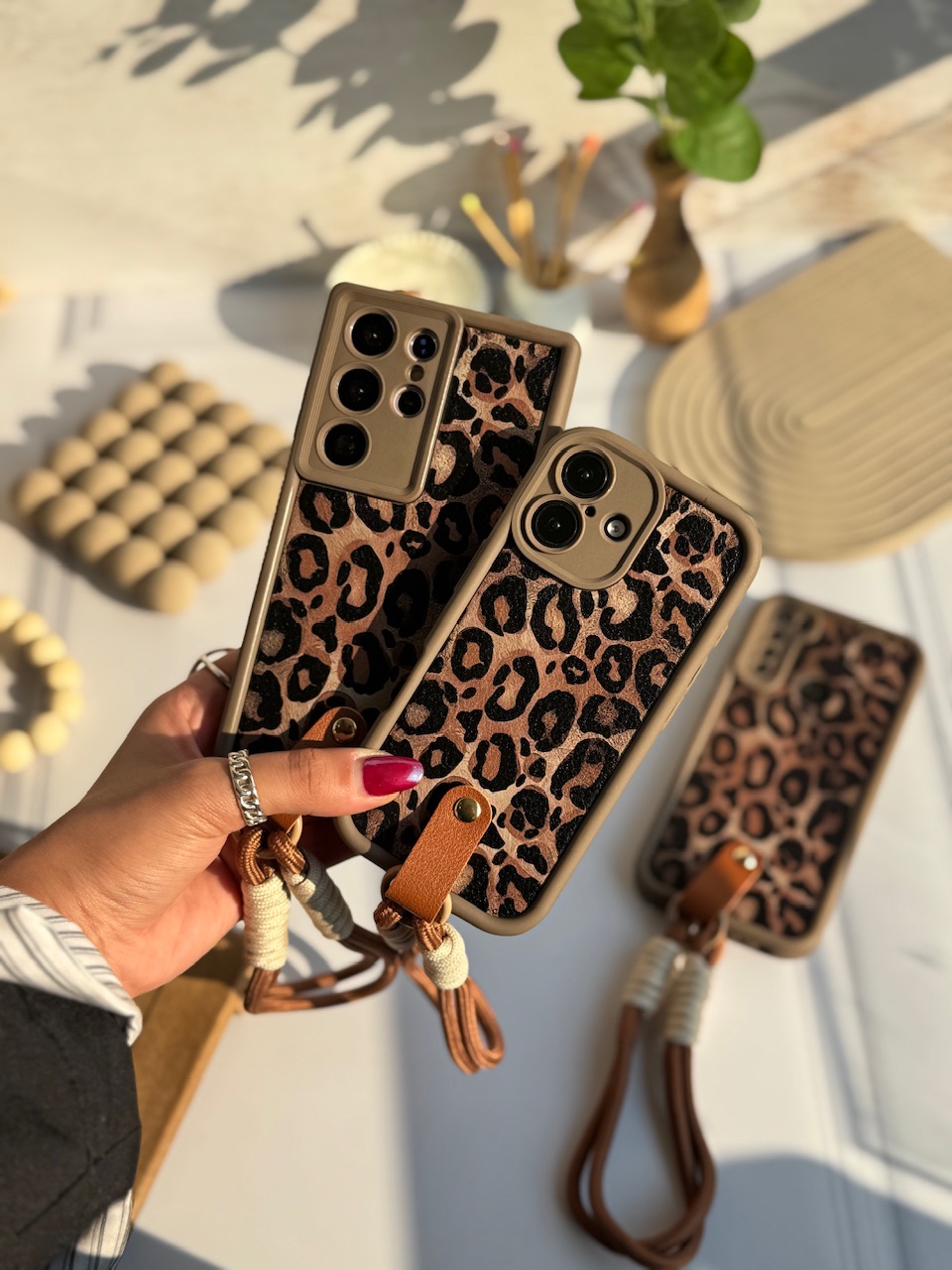 قاب پلنگی قهوه ای سالید با آویز آیفون سامسونگ شیائومی (کدC1925)