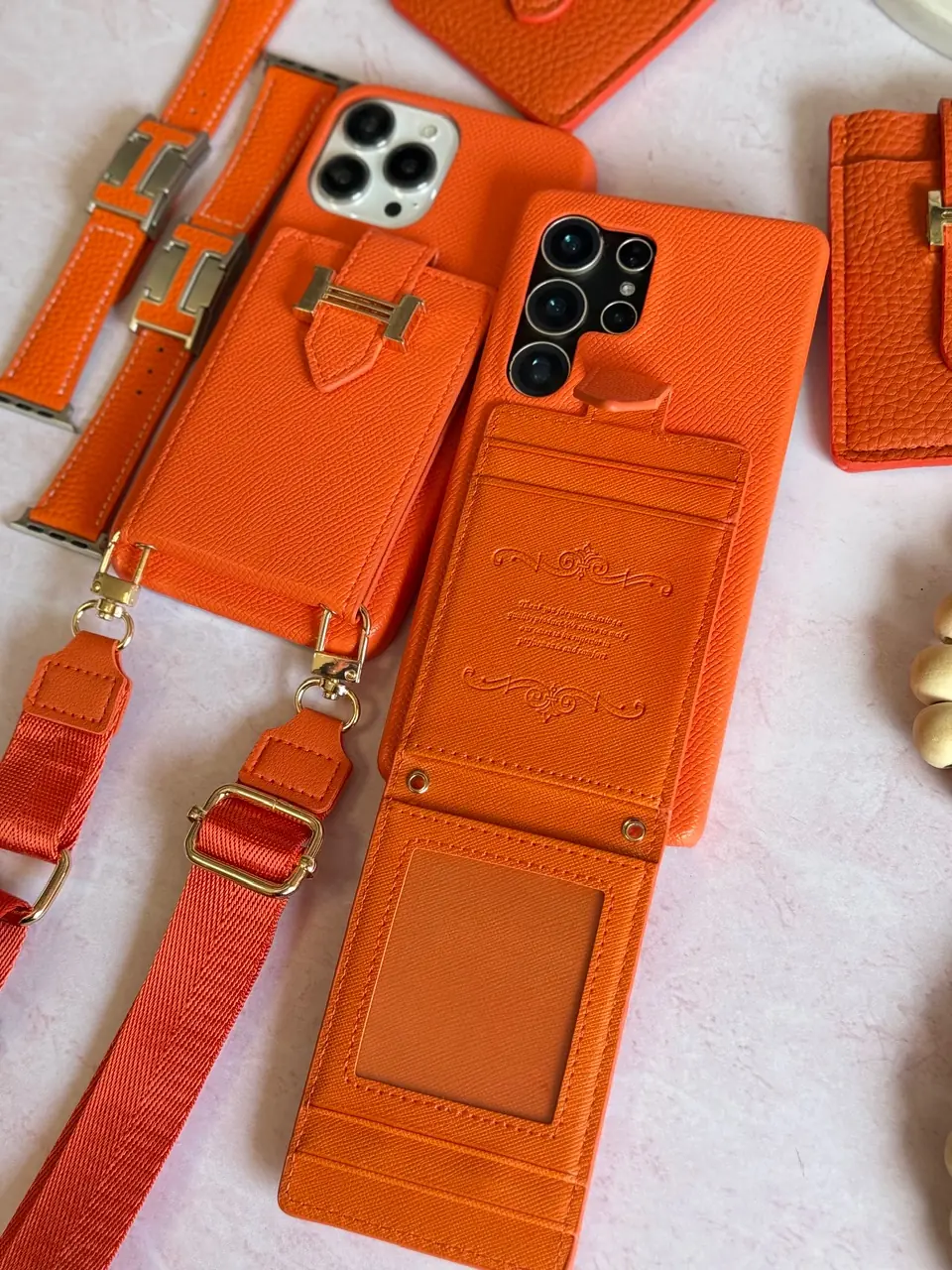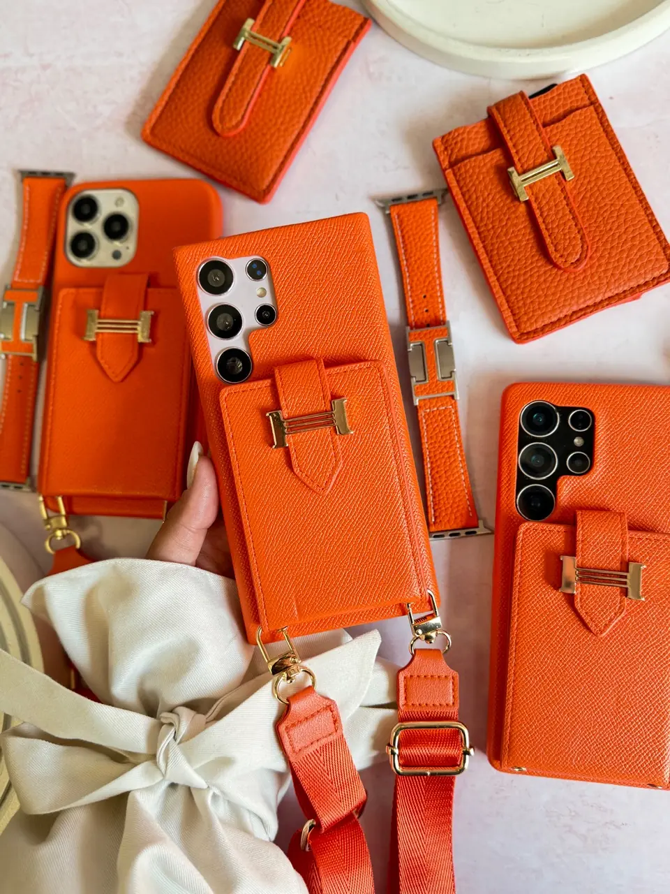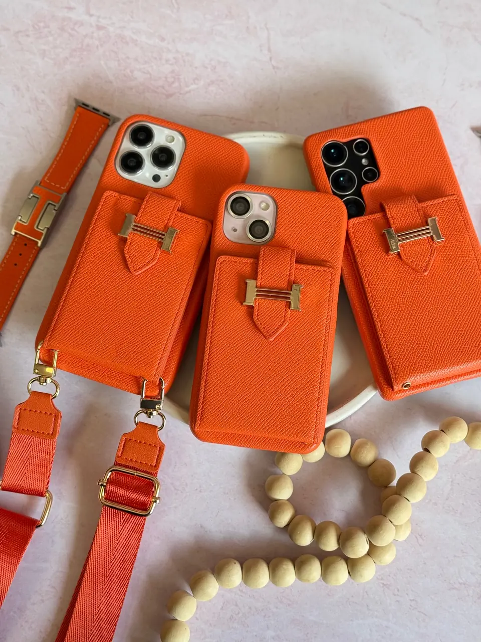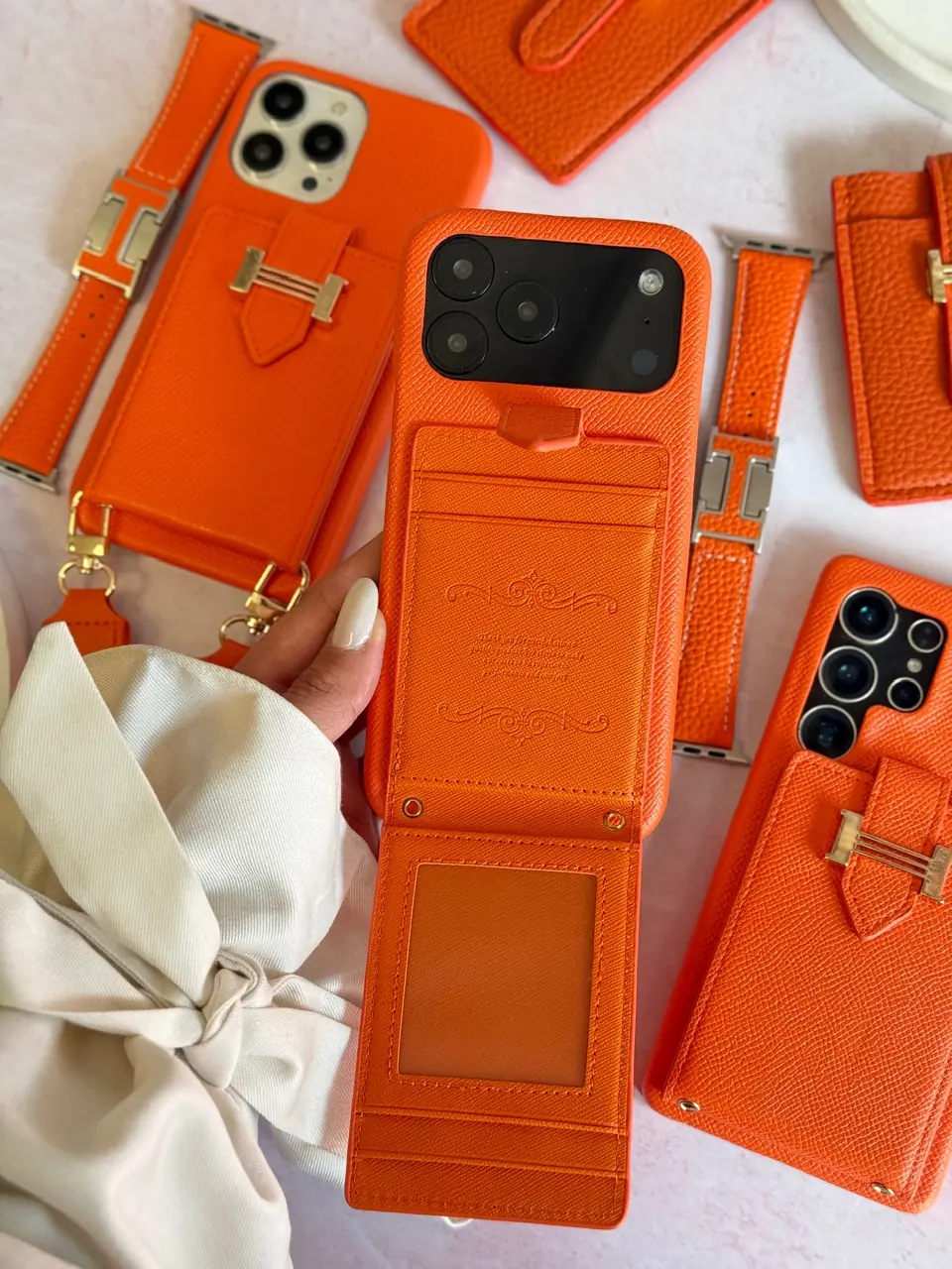 قاب هرمس کیفی چرمی با بند بلند رنگ نارنجی (کدC2201)